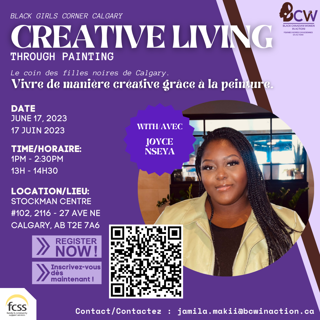Rejoignez-nous le 17 juin 2023 pour une session extraordinaire sur ce qu'est une vie créative à travers la peinture avec l'animatrice spéciale Joyce Nseya ! Soyez créatifs et uniques. Cette session de Vie créative aura lieu dans les bureaux de BCW à Calgary (#102, 2116 - 27 Ave Calgary, Alberta T2E 7A6). Vous pouvez scanner le code QR pour vous inscrire dès maintenant.