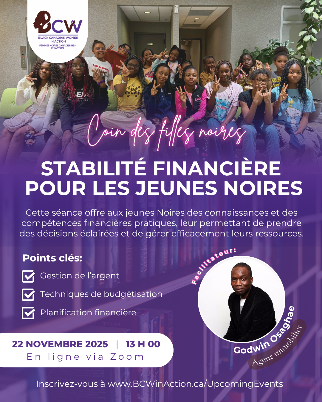 La prochaine séance des Séances de Bien-être Mental et de Développement Personnel pour les Jeunes approche à grands pas! Cette séance permet aux filles noires d’acquérir des connaissances et des compétences financières pratiques afin de prendre des décisions éclairées, de gérer leur argent judicieusement et d’assurer leur stabilité à long terme.