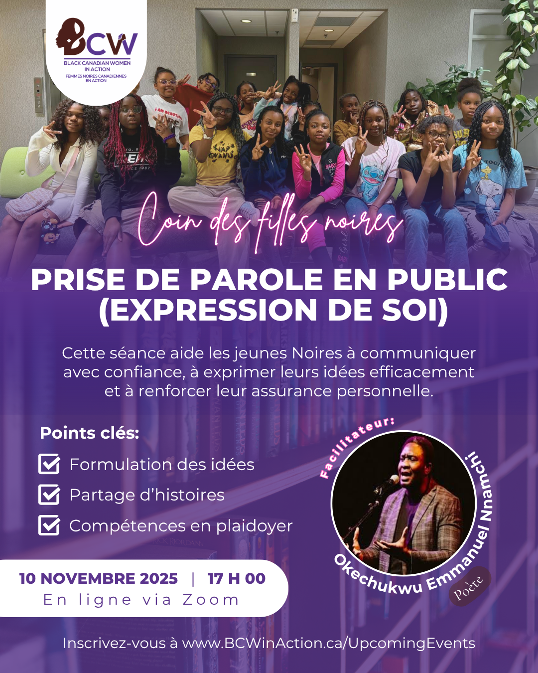 Joins-toi à nous pour la deuxième séance des Séances de Bien-être Mental et de Développement Personnel pour les Jeunes. Cette séance aide les filles noires à communiquer avec confiance, à exprimer leurs idées efficacement et à renforcer leur assurance dans un environnement bienveillant.