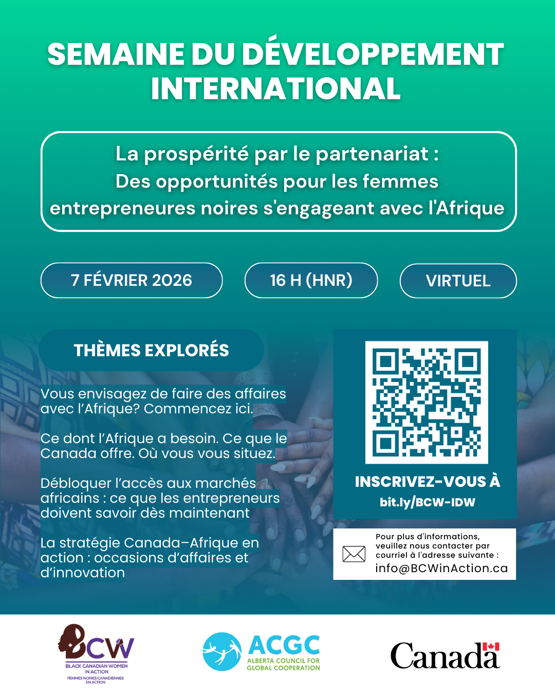Découvrez des occasions et des partenariats pour les entrepreneures noires qui font des affaires en Afrique. Participez avec Black Canadian Women in Action à la Semaine du développement international 2026 — thème : Prospérité par le partenariat. Présentations d’expertes et échanges dynamiques sur les tendances Canada–Afrique, les pistes de collaboration et des conseils concrets pour entrer ou accroître son activité sur les marchés africains. Ouvert et accessible à toutes et à tous.